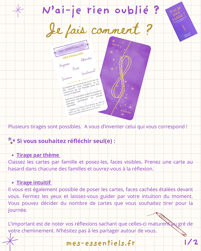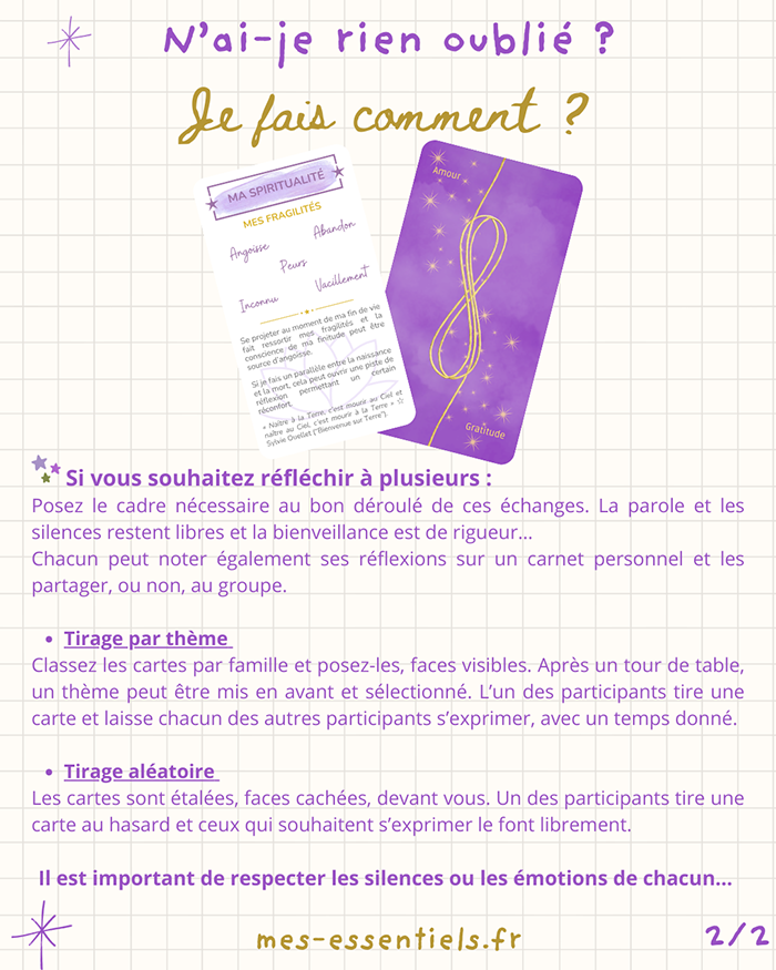 Même si elles évoquent la fin de vie, ces 38 cartes célèbrent avant tout la Vie ! Elles permettent de partager ce qui compte vraiment pour nous. Elles sont une invitation à mettre en lumière, à tout moment de notre vie, nos aspirations profondes et nos valeurs, à transmettre ce qui est essentiel pour nous. Elles permettent un cheminement spirituel et ouvrent un espace de réflexion autour de la fin de vie.